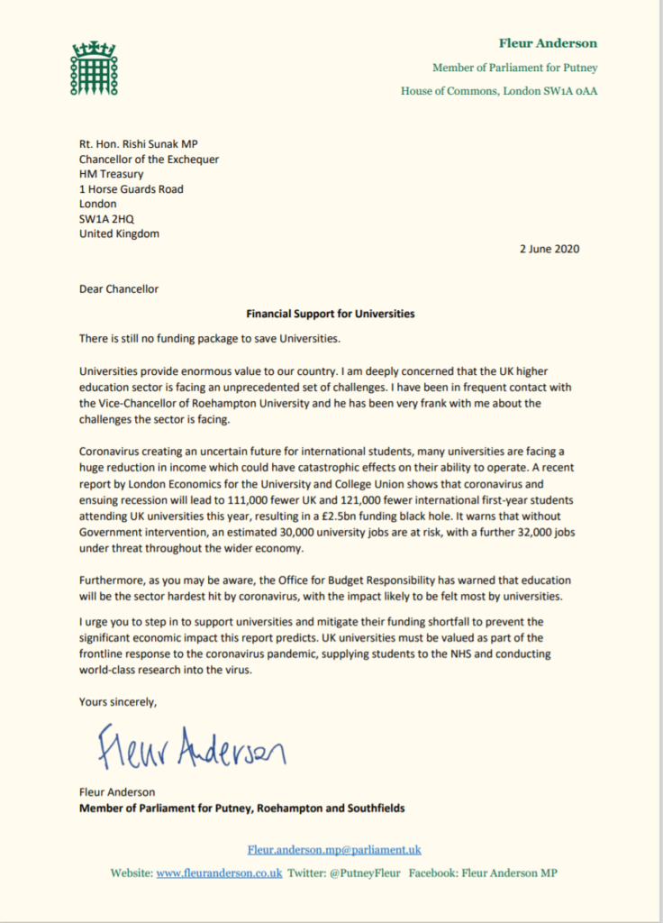 Fleur has written to the Chancellor requesting an urgent financial support package for Universities.