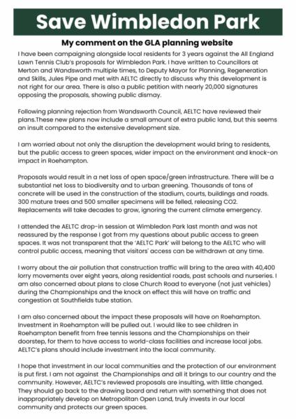 Letter to Deputy Mayor of London regarding AELTC proposals for Wimbledon Park