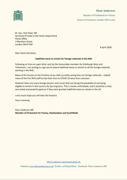 Letter: Indefinite Leave to Remain for foreign nationals in the NHS