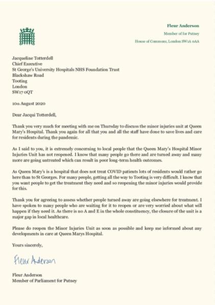 Fleur asks for the minor injuries unit at Queen Mary’s Hospital to be reopened