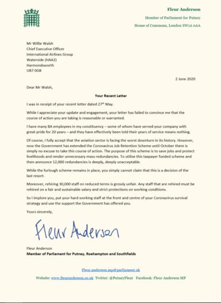 Letter: Prime Minister and Willie Walsh, CEO of IAG on planned redundancies at British Airways