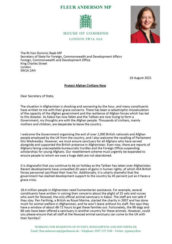 Afghanistan – Urgent Letter to Secretary of State