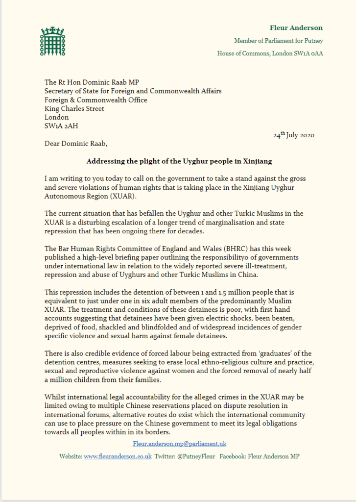 Fleur Anderson has today written to the Foreign Secretary, Dominic Raab, to ask that action is taken against Chinese officials to protest against the severe violation of Uyghurs rights.