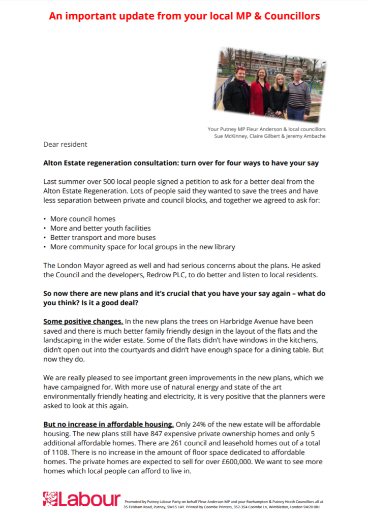 Fleur has written to residents on the Alton Estate ahead of the upcoming consultation on the regeneration.