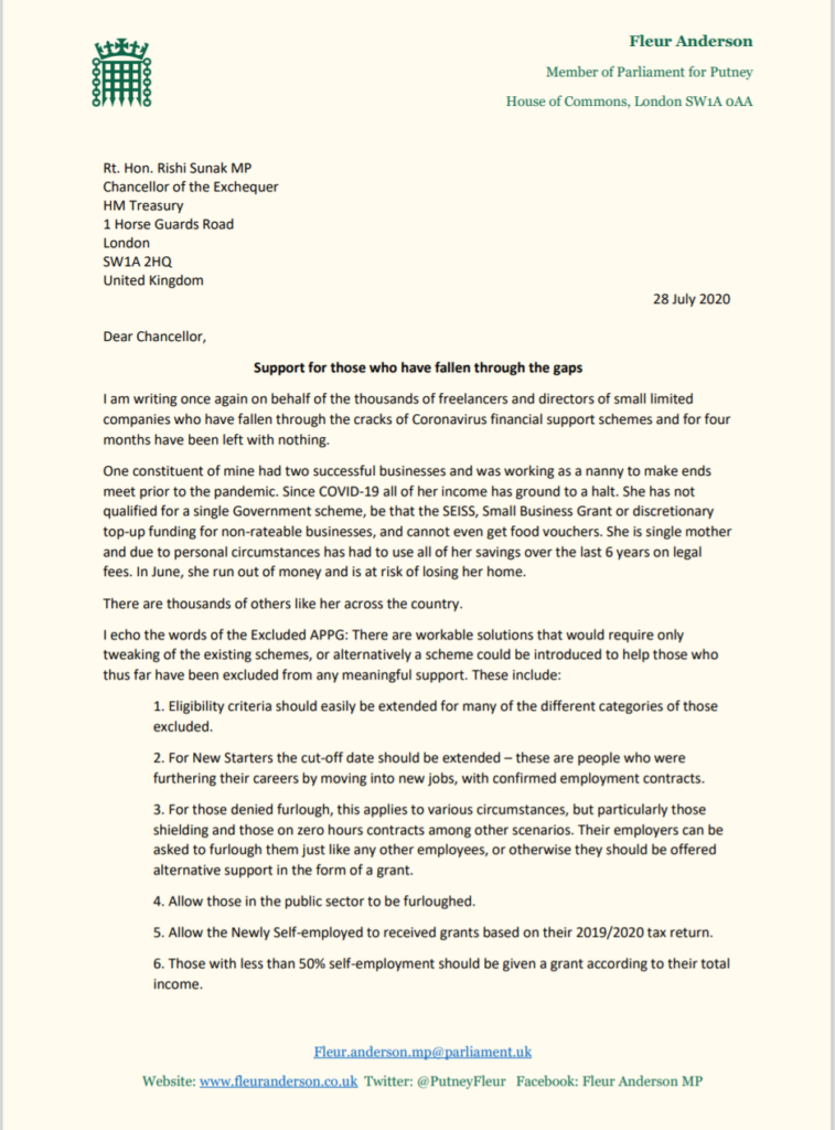 Fleur has written to the Chancellor urging him to extend support to Freelancers and Small Limited Company Directors and listen to the recommendations of the Excluded APPG.
