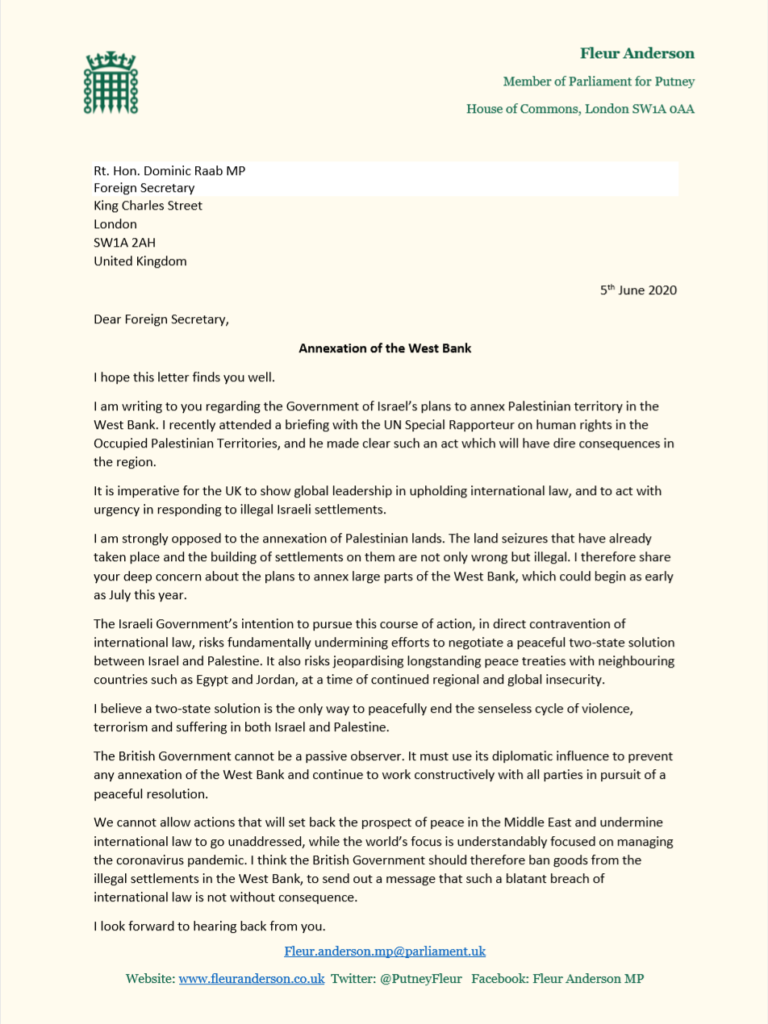 Fleur has written to the Foreign Secretary expressing her concern over the Israeli Government’s plans to formally annex the West Bank