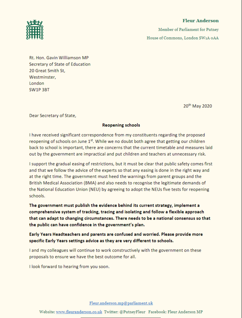 Fleur has written to the Secretary of State for Education, the Rt. Hon. Gavin Williamson, expressing her concerns over the Government’s plan to allow schools to return on June 1st.