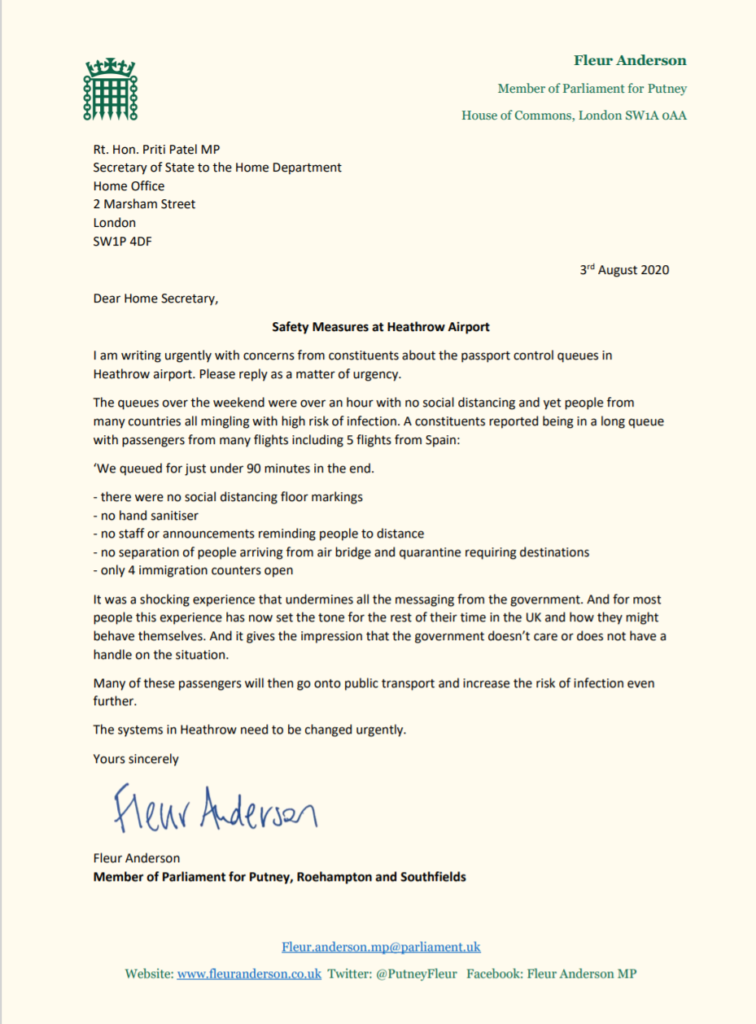 Fleur has today written to the Home Secretary for the second time highlighting a deeply concerning lack of COVID security at Heathrow Airport following the experiences of several constituents