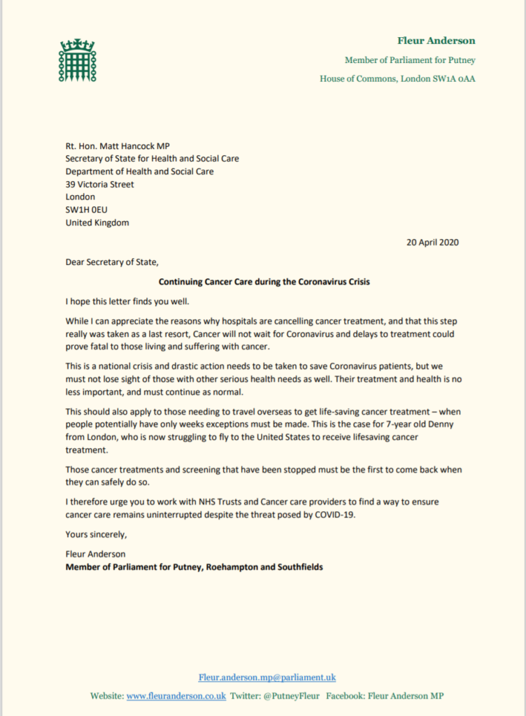Fleur has written to the Secretary of State for Health and Social Care urging the continuation of cancer services during the Coronavirus Pandemic