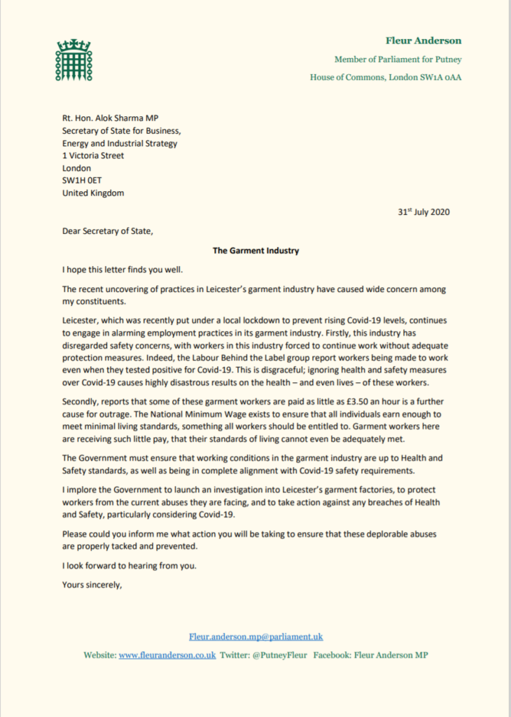 Fleur has written to the Business Secretary expressing her concern at working conditions in the garment industry in Leicester
