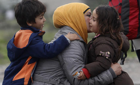 A boy and a girl hug a woman as they arrive at the transit camp for refugees near the southern Macedonian town of Gevgelija, after crossing the border from Greece, on Thursday, Oct. 8, 2015. Several thousand migrants and refugees enter daily from Greece into Macedonia on their way through the Balkans towards the more prosperous European Union countries. More than 500,000 people have arrived this year in EU seeking sanctuary or jobs, sparking the EU's biggest refugee emergency in decades. (AP Photo/Boris Grdanoski)